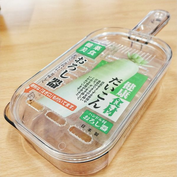Diese Rettichreibe kommt mit einem Auffangbehälter und Auslauf. Ein kleiner Bereich zum Feinreiben, z.B. von Resten und der größere Bereich für mittel bis groben Rettichabrieb.