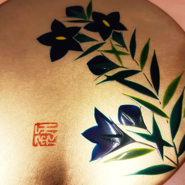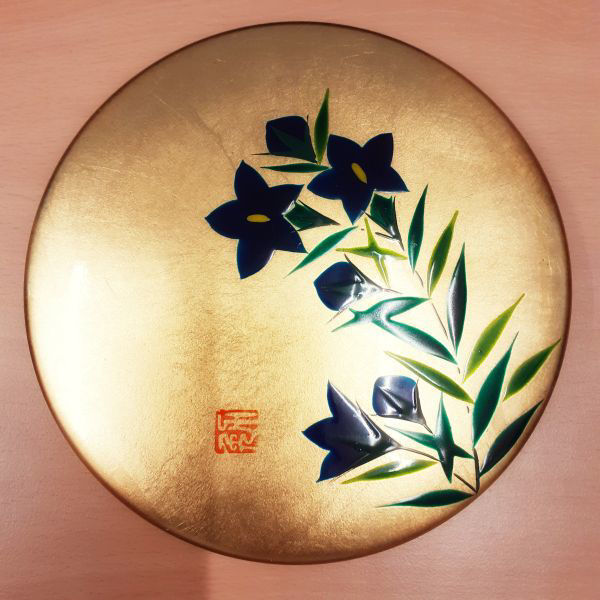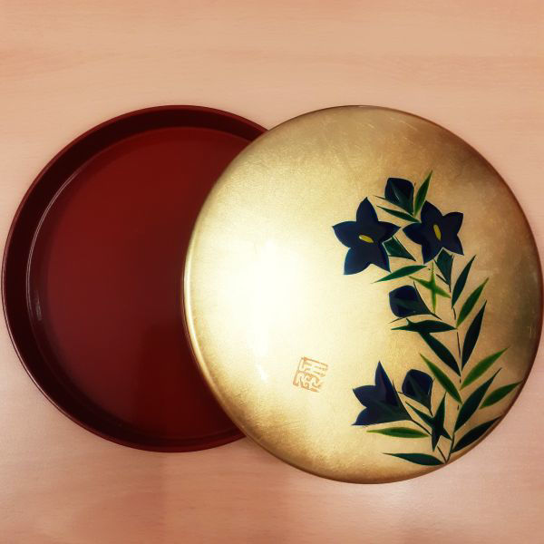 Oberer Deckel innen rot, aussen mit Urushilack gold mit Blumendekor handbemalt
