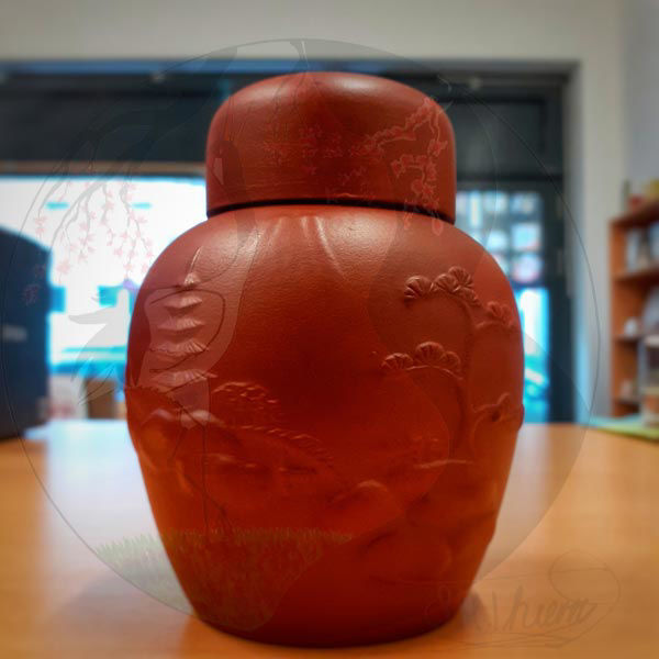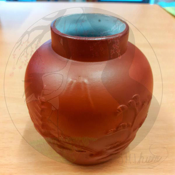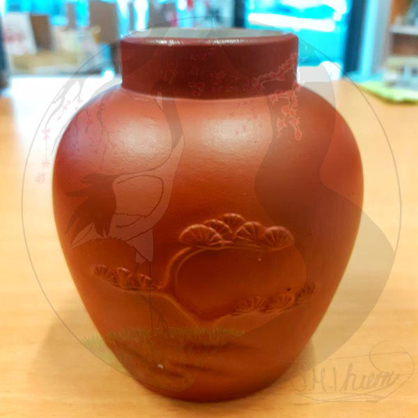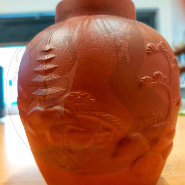 Der Topf hat Ausprägungen in Form eines Tempel mit Felsen, des Fujis, eines Schiffes, einer Brücke und Kiefern